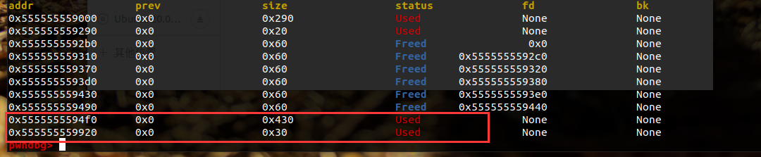 申请出两个堆块,然后再将其释放,顺序为 b -> a。