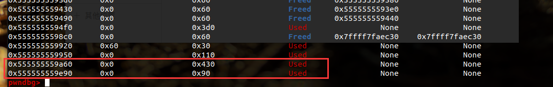 再释放两个同样为 0x100 的堆块,这两个堆块会进行合并。