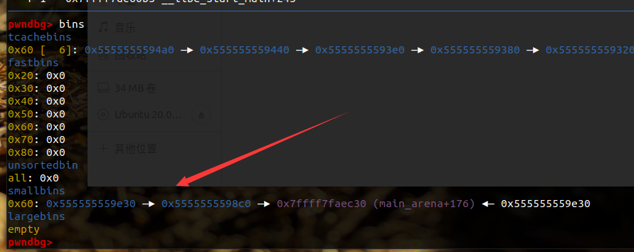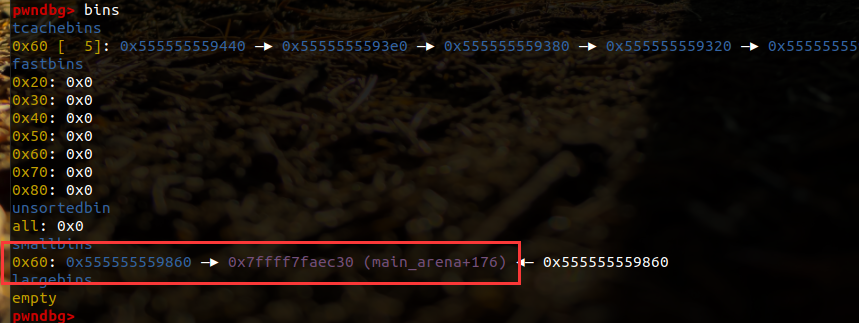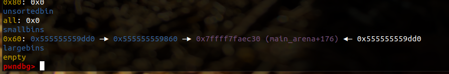 跟 tcache_stashing_unlink 中的一样的做法,让一个size也为0x60的堆块进入到small bin中。