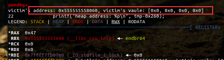 - 此时 target1 将被放入 tcache 中,同时对 target2 写入一个 libc 地址。