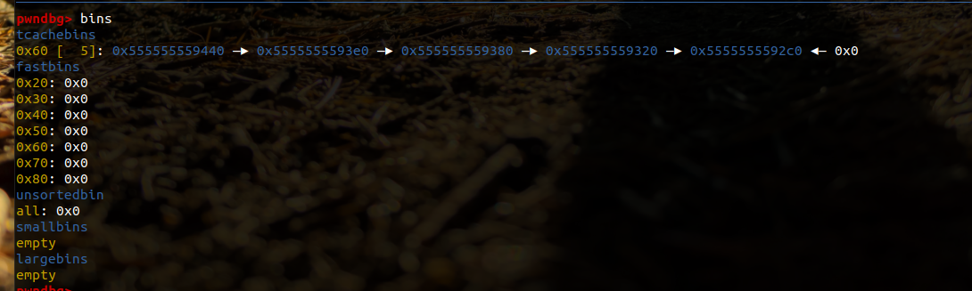 - 选定一个 n = size,释放五个大小为 n 的堆块进入到 tcache bin