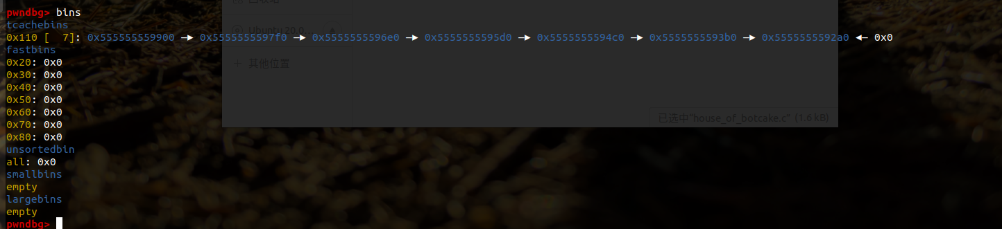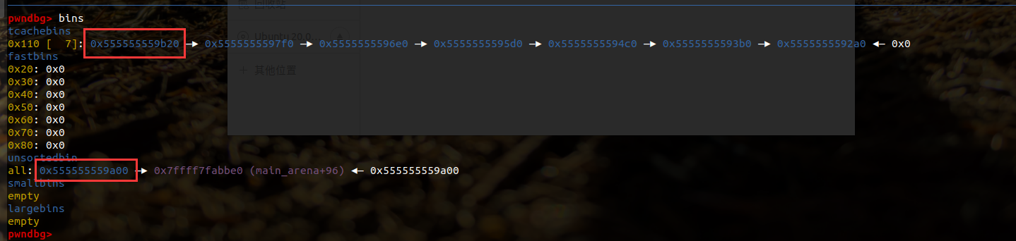 申请一个 0x100 的堆块,空出一个 tcache bin。