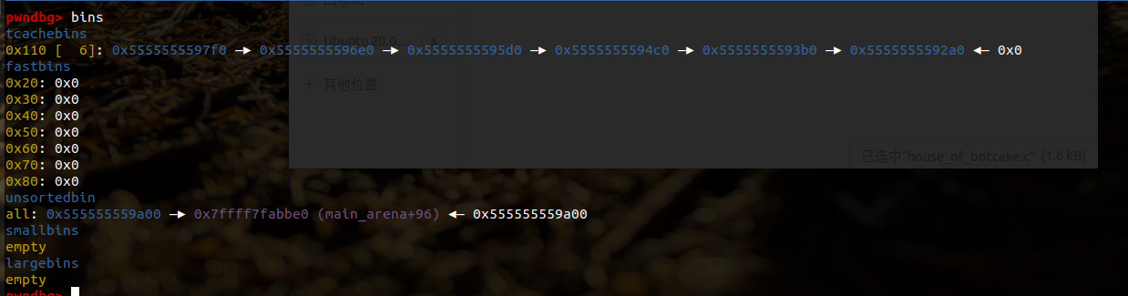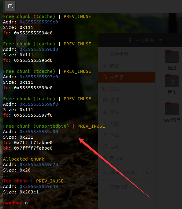 申请一个大于 0x100 的堆块,绕开 tcache,而获得到了 unsorted bin 里的堆块,但是这个堆块可以覆盖存在于 tcache 里的堆块,最终造成可以地址分配堆块,任意地址写。
