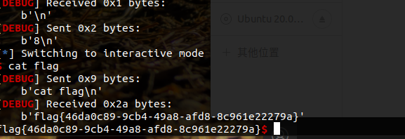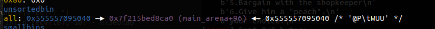 两次刚好足够,一次填写地址,一次分配堆块达成任意写,这次就不要再用0x70分配,透支了两次,已经坏掉了。最开始是想要填入system地址的,但是因为堆块的前0x10都是已经填入了内容,使用了||貌似也没办法忽略,所以最后还是用了one_gadget getshell。