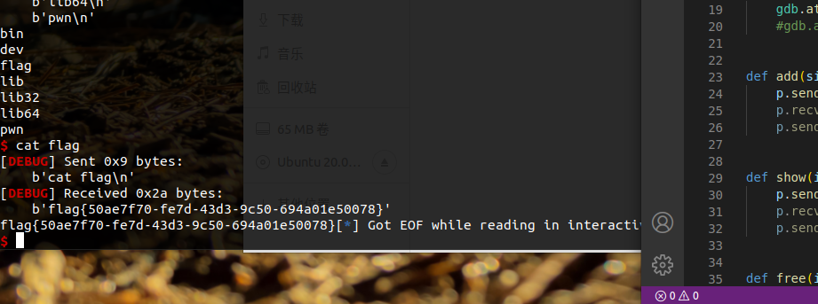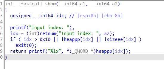 def show(idx): p.sendlineafter(b"your choice:\n", b'4') p.recvuntil(b"index?\n") p.sendline(str(idx).encode('ascii'))