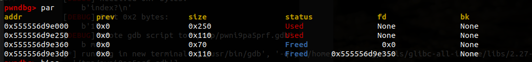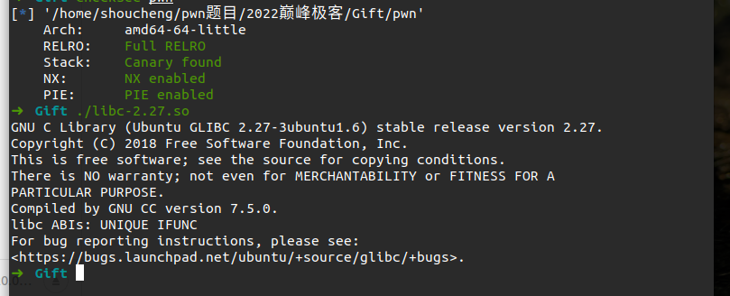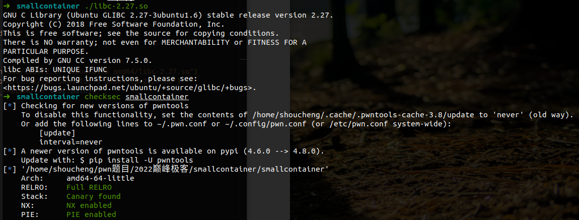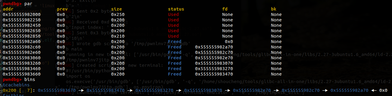 检查保护机。这题没给libc,我是通过 double free 以及打印fd的内容,判断版本应该是在2.27,小版本我直接用到了最高的去调试。