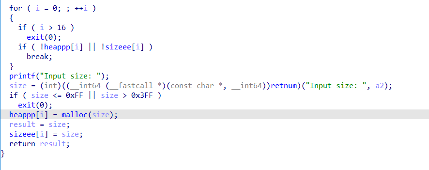 可以申请最多17个堆块,大小范围在 0xFF~0x3FF之间,记录堆块地址以及堆块大小。