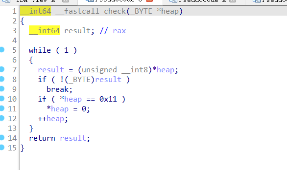 这里的输入完内容后执行的函数存在问题:填满堆块时,如果下一个堆块的size存在0x11结尾,将会被置0,可看为offbynull。