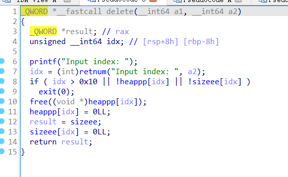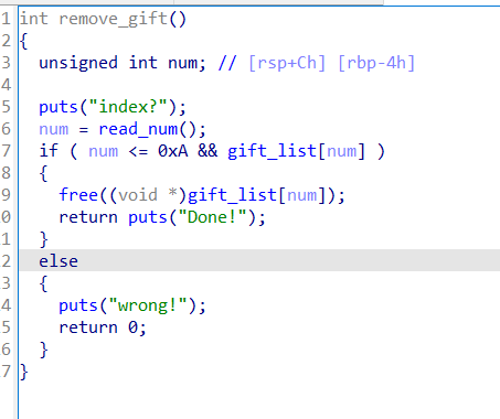 def free(idx): p.sendlineafter(b"> ", b'2') p.recvuntil("Input index: ") p.sendline(str(idx).encode('ascii'))