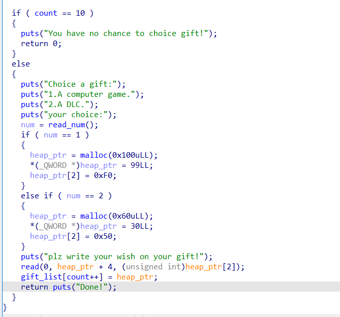 def add(size, content): p.sendlineafter(b"your choice:\n", b'2') p.recvuntil(b"your choice:\n") if size == 0x100: p.sendline(b'1') else: p.sendline(b'2') p.recvuntil(b"plz write your wish on your gift!\n") p.send(content)