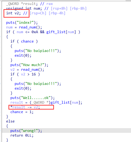 这里的v2是有符号数,所以如果为负数时,就可以让一个堆块的fd指针加上一个较大的数。