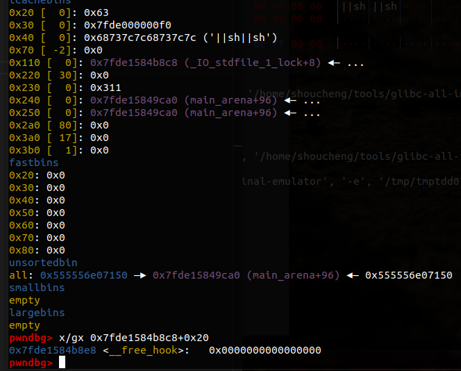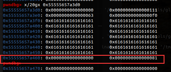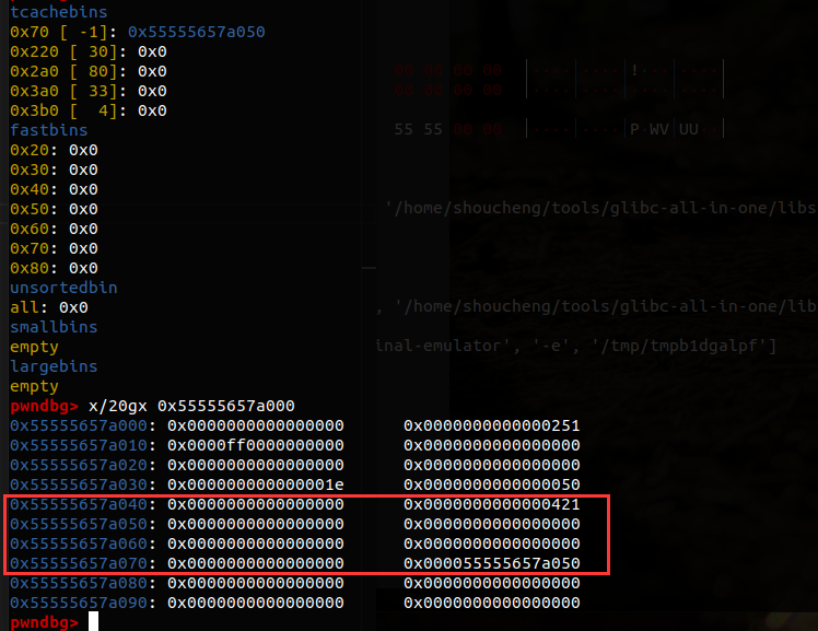 这一步的构造算是最巧的一步了,当初也想了挺久的。在把堆块分配过去后,为了能够出现libc地址,需要去伪造一个size至少为0x420的堆块,所以我借助部分的tcache bin加上之前申请的堆块进行伪造大堆块,(同时这也是另外一个需要申请两个0x110堆块的理由,如果是两个0x70的堆块是不够长的);且需要将其释放掉,则在属于0x70的位置上填入了伪造堆块的地址,可以让堆块分配过来。