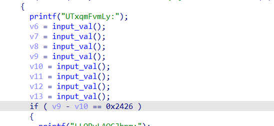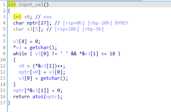 要满足0x2426即9254,而这个获取输入的逻辑为不为空格,且循环次数不能大于19次,他就会一次读一个字符,而最后把读取到的字符转为int类型。所以,为了达成9254,则拆分成’9’,’2’,’5’,’4’进行输入,然后再以一个空格结尾结束getchar。而后面的几个都以输入空格即可,因为返回值就是0,没必要单独取0。