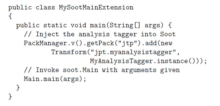 我们可以扩展 Soot 的 Main 类以包括我们自己的分析,将一个中间步骤注入到 Soot 中,使得 Soot 可以运行我们自定义的分析并处理传递给它的所有其他选项。过程间(inter-procedural analysis)需要注入到 wjtp 阶段而过程内(intra-procedural analysis)则注入到 jtp 阶段。下图的代码示例展示了如何将一个类 MyAnalysisTagger(执行某些 intra-procedural analysis)的实例注入到 Soot 中。
